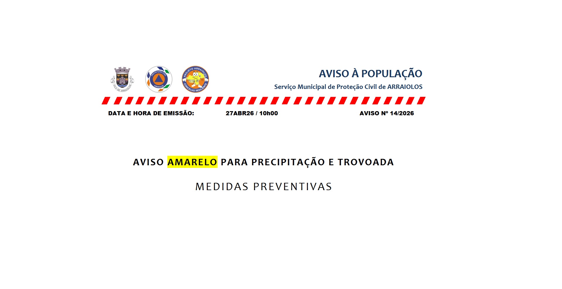 AVISO AMARELO para PRECIPITAÇÃO e TROVOADA, entre as 13:00UTC de 28.04.2026 e as 22:00UTC de 28.04.2026, e de acordo com as previsões meteorológicas disponibilizadas, salientam-se: